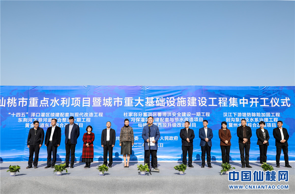 市委常委、常务副市长吴熙垚在开工仪式上致辞。他代表市委、市政府向一直以来关心支持我市水利事业发展的中央和省直有关部门表示衷心感谢。他说,近年来,我市在省委省政府的正确领导和省水利厅的大力支持下,兴建了一批重点水利工程,实施了一批民生水利项目,水安全保障能力持续提升,水利综合功能不断增强,现代水利体系逐步完善。这次集中开工的一批重点水利项目暨城市重大基础设施建设工程,是我市大力实施“四水共治”的生动实践,是补齐水利基础设施短板的有力举措,对保障人民群众安居乐业和经济社会发展必将发挥重要作用。我们诚请省直有关部门以更大力度支持仙桃水利建设,希望市直有关部门和乡镇强化担当意识,认真履职尽责,为项目建设提供一系列优质服务。吴熙垚同时要求参建各方发扬工匠精神,强化质量和安全管理,确保工程顺利实施、早日建成受益。(文/仙桃日报记者 陈国力 摄/仙桃网记者 黄芸)