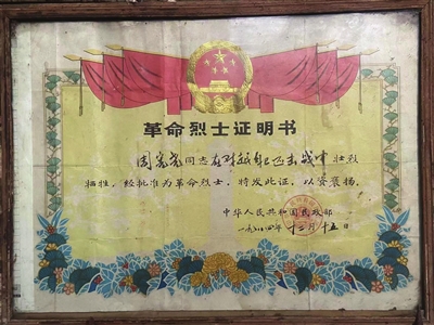 走进烈士周宪尧参军前生活过的旧屋,家门口的墙上,挂着“光荣之家”的牌子。主屋正前方,烈士遗像和烈士证明书被裱起来高高挂起,他的父亲周后斌、母亲卢佩凤生活在此。两位老人已年近90,身体状况不佳,小儿子在身边照顾。
