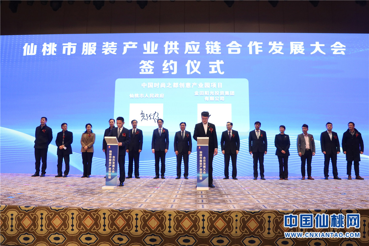 大会举行了签约仪式。在热烈的掌声中,市政府与金田阳光投资集团有限公司签订中国时尚之都创意产业园投资意向书,广州伟艺纺织布料行与市纺织服装产业协会签订服装产业战略合作协议,仙桃市城市之光快运有限公司与市纺织服装产业协会签订物流运输合作意向书,工商银行仙桃支行与部分服装企业签订融资贷款协议,毛嘴、郑场、陈场、剅河、通海口、三伏潭、彭场、杨林尾、龙华山、郭河等镇办分别与相关纺织服装企业签订投资意向协议。从本轮签约情况看,纺织服装签约项目60个,计划总投资263.64亿元,其中中国时尚之都创意产业园项目拟投资200亿元。