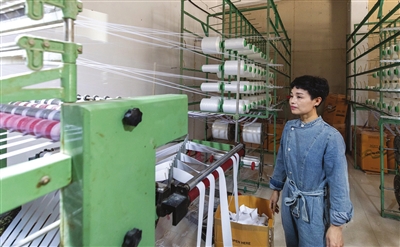 毛嘴镇成立服装产业村企联合党支部,促进村企联动、农民增收,图为滔滔松紧带加工厂按订单赶制产品。