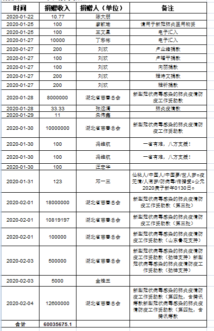 2020年1月22日至2020年2月4日,仙桃市慈善总会共接收疫情防控社会捐款和省慈善总会拨付捐款共计60035675.1元,现予以公告。
