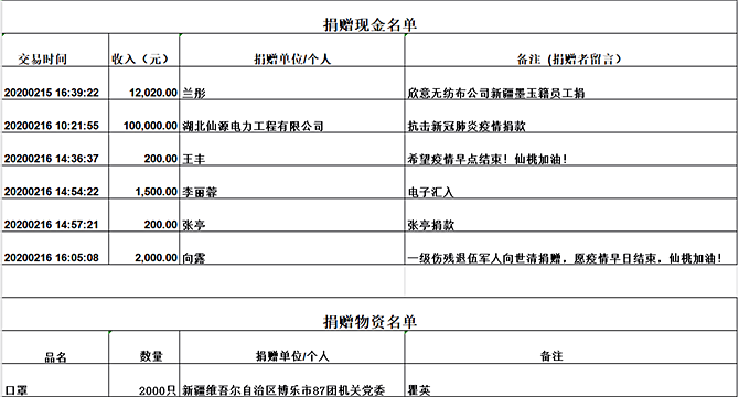 2020年2月16日,共接受社会捐赠款项115920元,口罩2000只。具体明细如下: