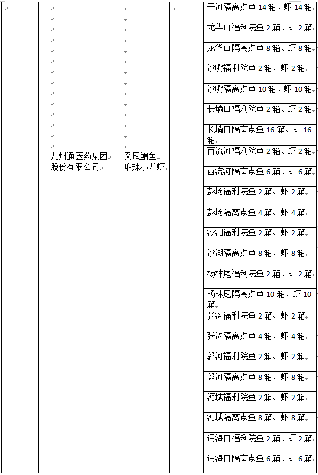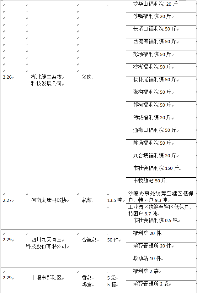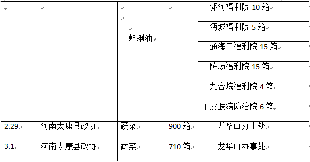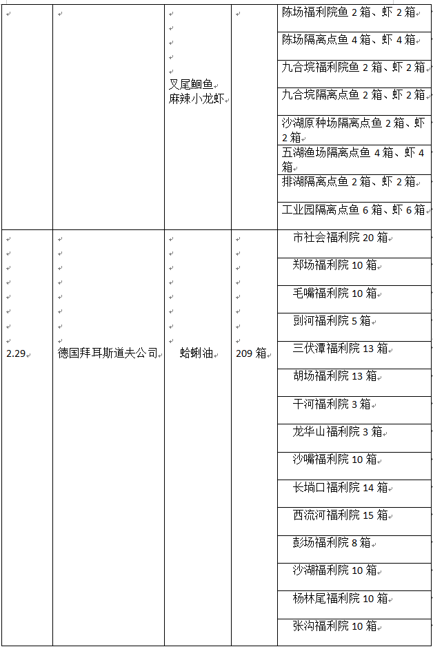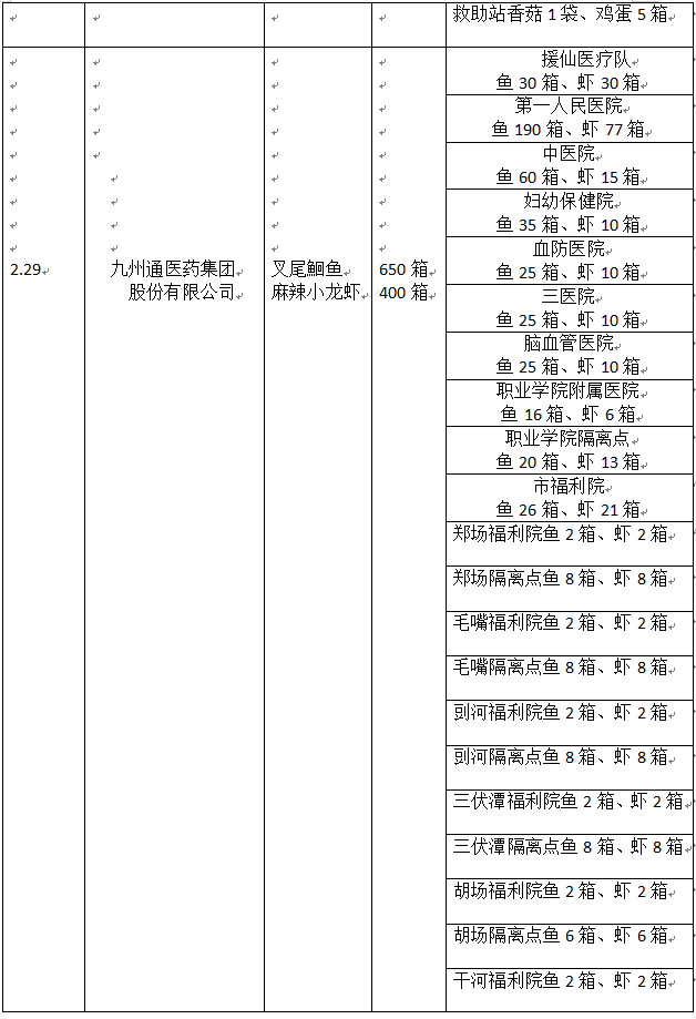 为支援我市新冠肺炎疫情防控工作,社会各界踊跃捐赠,截止2020年3月1日24时,仙桃市慈善总会陆续接收来自社会各界爱心企业和爱心人士捐赠的生活物资,本期共接收和发放蔬菜13.5吨另1660件、猪肉1000斤、鮰鱼650箱、麻辣小龙虾400箱、蛤蜊油209箱。连前累计接收和发放蔬菜764.385吨另2710件、水果222吨另170箱、大米65.5吨另90袋、75度酒精360瓶、其他食品200件、消毒液62桶,隔离衣41箱、口罩原材料10.26吨、挂面108件、鸡蛋5吨790箱、肉鸡0.5吨、药品8280盒、真巧100件、蛋糕3公斤、脉动饮料500箱、猪肉1000斤、鮰鱼650箱、麻辣小龙虾400箱、蛤蜊油209箱。现将本期物资分配情况公告如下: