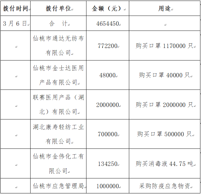 根据仙桃市新冠肺炎疫情防控指挥部要求,现将市防控指挥部统一调配使用的市慈善总会捐赠资金分配情况公告如下: