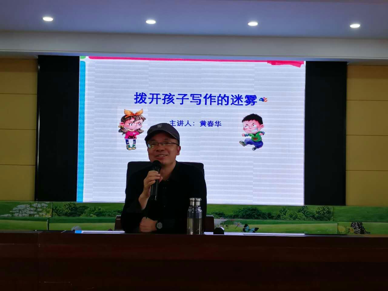 5月8日下午,仙桃小学学术报告厅人头攒动、座无虚席。深受全国小读者喜爱的著名儿童文学作家黄春华应邀来到仙桃小学,分别为该校南、北两个校区的3—6年级同学及全体语文教师作了题为“拨开孩子写作的迷雾”的知识讲座。