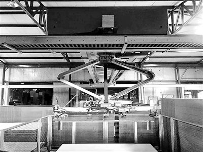 飞美家具工厂立体化数字料仓中,机械臂根据前端传送过来的数据安排,在料仓上空灵活穿梭,有条不紊地用吸盘从不同地方抓取各式花色、规格的板材,并将之一一送往对应的切割机械处,55种不同花色的板材被精准提取。