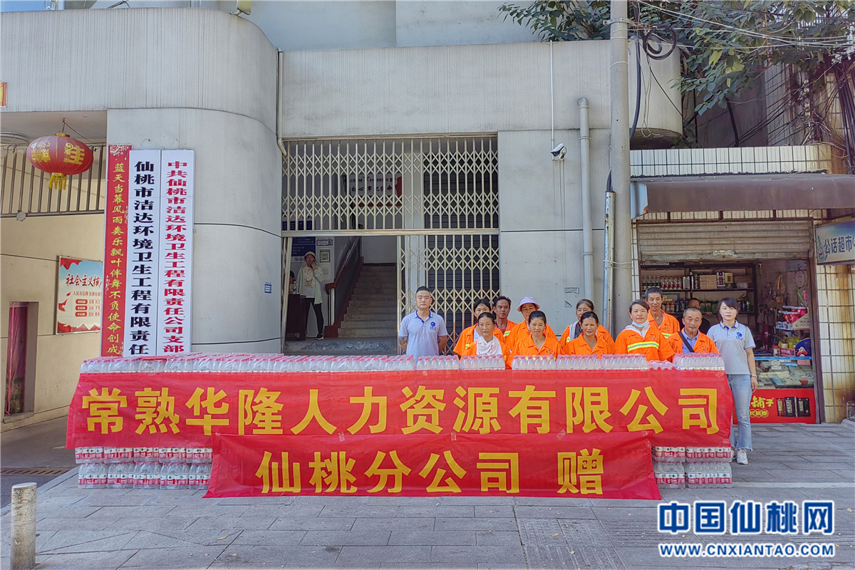 连日来,我市持续高温,环卫工人战酷暑守一线,“汗”卫着城市的干净整洁,一些爱心企业送来夏日清凉。8月10日上午,爱心企业常熟华隆人力资源有限公司仙桃分公司给市环卫局洁达公司的环卫工人送上200箱,共4800瓶矿泉水,为环卫工人送上一份清凉。