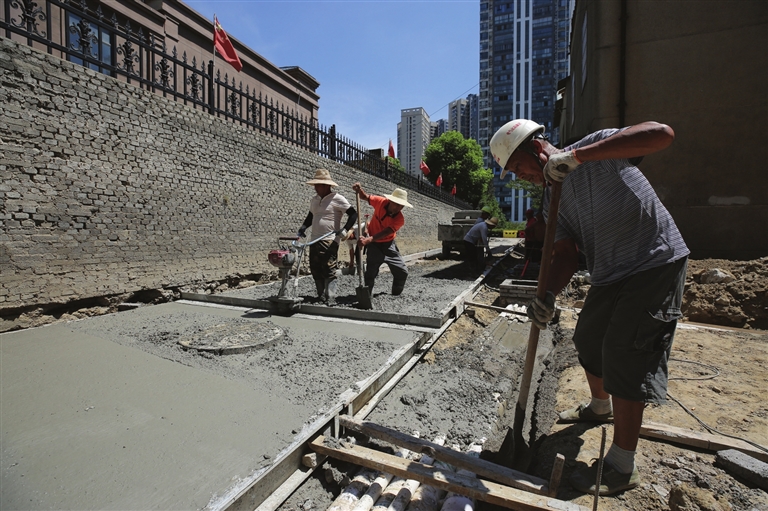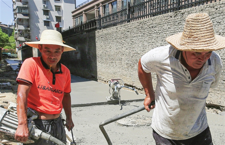 图一为8月11日,施工人员在大洪小区铺设背街小巷的路面。图二为来自干河街道窑台村的工人正在大洪小区进行路面作业 。图三为8月7日,仙桃大道中段,四达公司的员工在烈日下刷黑路面。(摄影记者 晴霄 通讯员 王克荣)