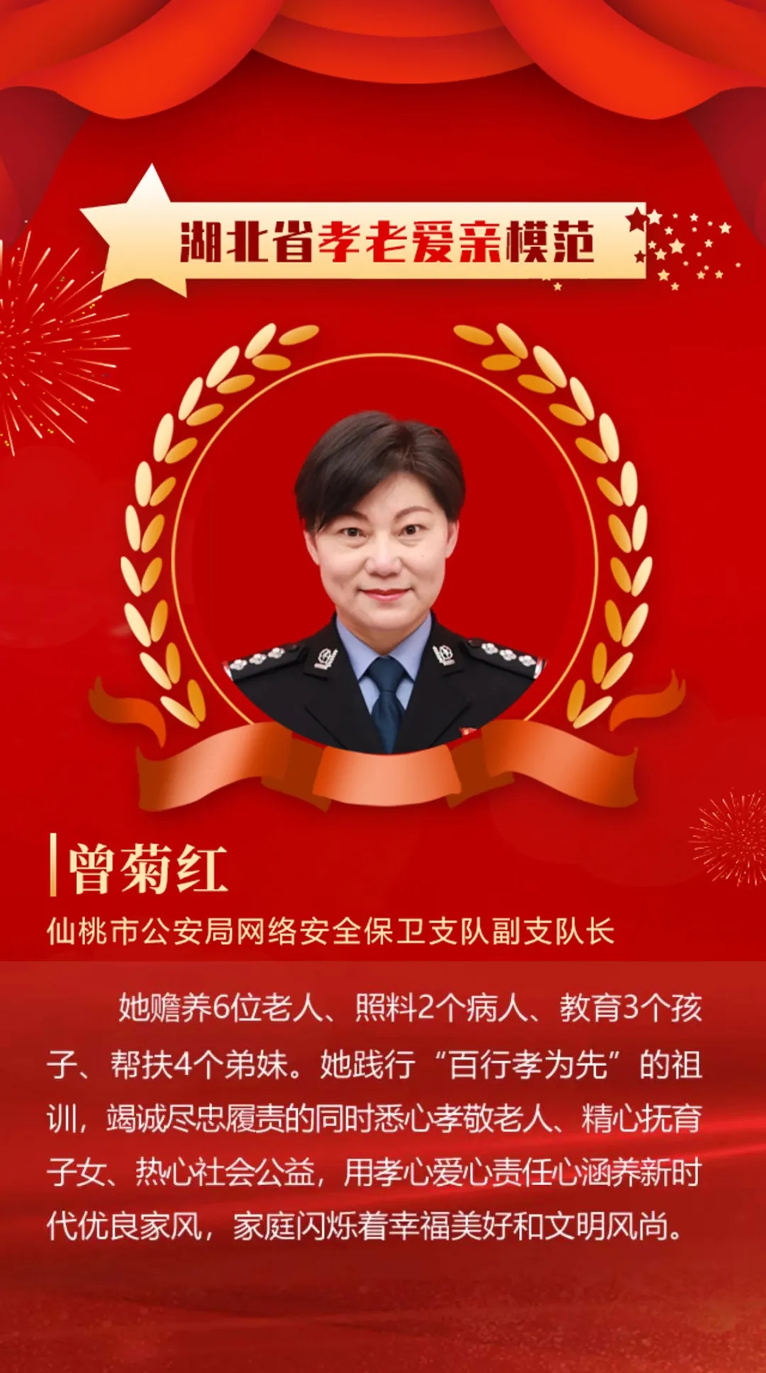 1994年从警校毕业的曾菊红被分配到仙桃市公安局,曾在彭场派出所、指挥中心、网安支队工作。无论在哪个岗位,始终不忘初心,忠诚履职,在出色完成本职工作的同时,将工作之外的时间和精力投入到对家人的关心照顾。先后荣立个人二等功1次、三等功3次,获评仙桃楷模、湖北省巾帼建功标兵、荆楚最美家庭、全国最美家庭、全国五好家庭等荣誉。