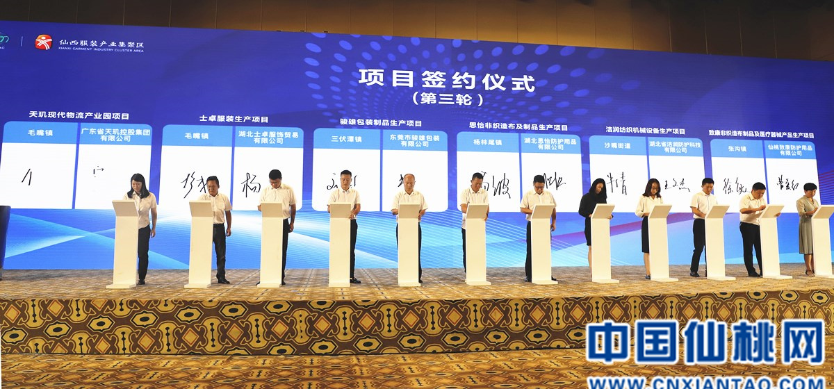 大会举行了签约仪式。在现场领导嘉宾见证下,市政府与武汉纺织大学签订市校合作协议;武汉纺织大学服装学院与毛嘴镇就“江汉服装产业创新发展研究中心”项目签约;毛嘴镇与全国重点裤业产销基地签订战略合作协议;仙西服装产业集聚区18个重点项目集中签约。