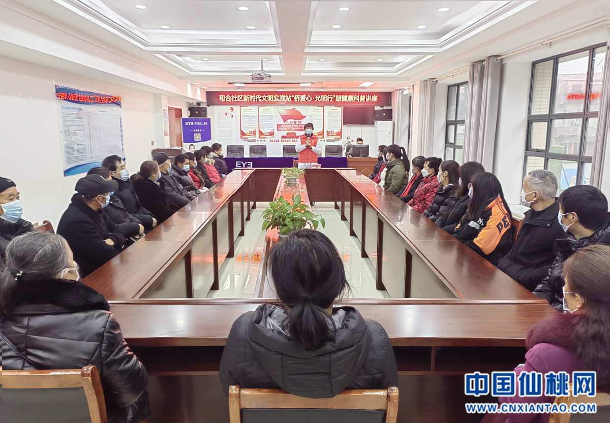 3月2日上午,和合社区新时代文明实践站邀请仙桃爱尔眼科开展“侨爱心·光明行”眼健康科普讲座,免费为老年人进行眼睛健康检查,宣传爱眼知识。 医护人员从什么是白内障、影响白内障的因素、如何预防白内障几个方面给老年人普及了用眼、护眼知识,并用带来的专业设备为老年人开展视力检测、眼底检查。