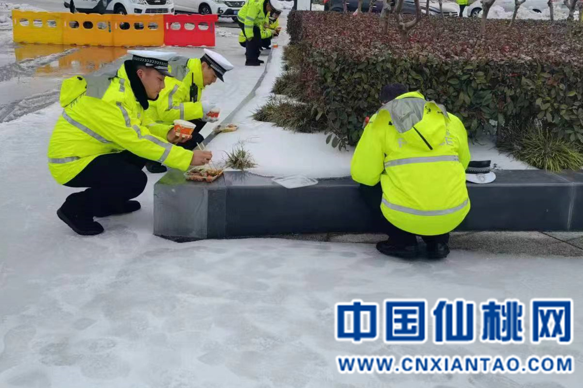 为了确保路面顺畅、有序,当日参与执勤的民警们就在皑皑白雪之中,轮流以花坛、汽车引擎盖为“餐桌”,吃了一顿盒饭,这也是一份特殊的“元宵晚餐”。