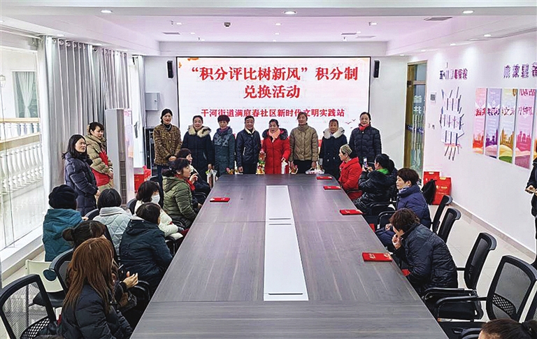 “我的积分可以换一袋米”“我的可以换一瓶洗衣液”……连日来,干河街道满庭春社区新时代文明实践站“积分评比树新风”积分制兑换活动现场气氛热烈。