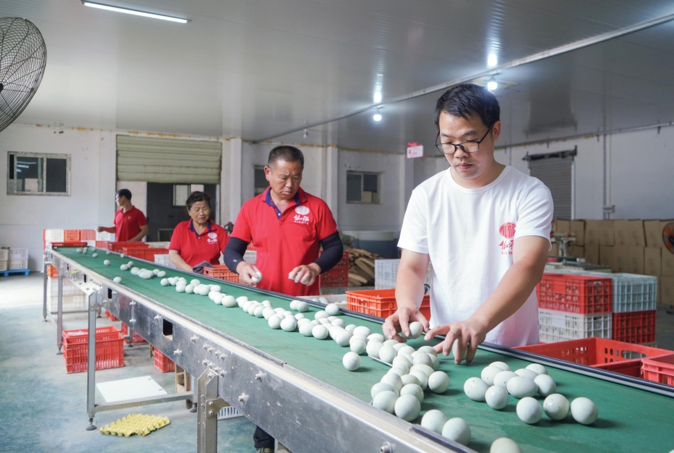 仙桃市仙福食品有限公司通过科学的养殖方法,实现蛋品供应的稳定性、高品质和高效益,积极探索“公司+基地+农户”的产业发展模式,带动当地农户参与蛋鸭养殖,增加农民收入。图为7月4日,皮蛋生产车间工人正在分拣装框。(摄影 记者邓娟)