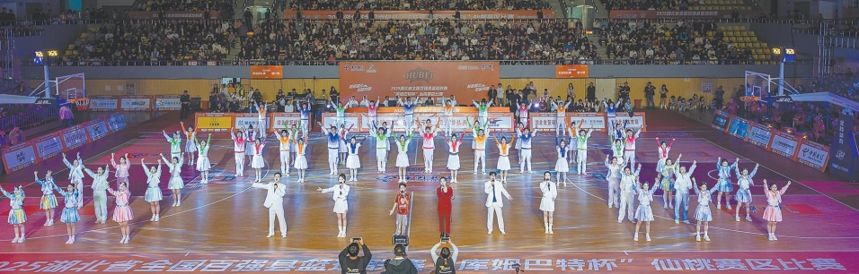 易边再战,赛事进入下半场。仙桃队迅速调整状态,开局一记3分追平比分。场上球员斗志昂扬,攻防博弈激烈,比分多次交替。现场观众热情高涨,“好球!”“进攻!防守!”的呐喊与擂鼓声交织,气氛热烈。