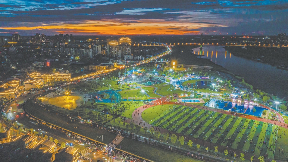 夜幕降临,沿江大道汉江奥运公园段灯火璀璨,市民们在此享受休闲时光。近年来,仙桃市实施城区亮化美化工程,推动“公园夜景”向“民生夜景”升级。通过智能调控的路灯、草坪灯以及景观灯等各类灯光交相辉映,与远处的城市灯火共同绘就了一幅绚烂的夜景画卷。摄影记者 郑恒