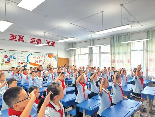 同一天,全市15万名中小学生重返校园。在这个特殊开学季,全市各个学校策划组织了“纪念抗战胜利80周年”“弘扬伟大抗战精神”“爱国主义教育”等红色主题的“开学第一课”,在孩子们心中播下红色的种子。中国红,成为今秋开学主色调。