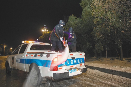 城管队员撒盐融冰。摄影记者邓娟