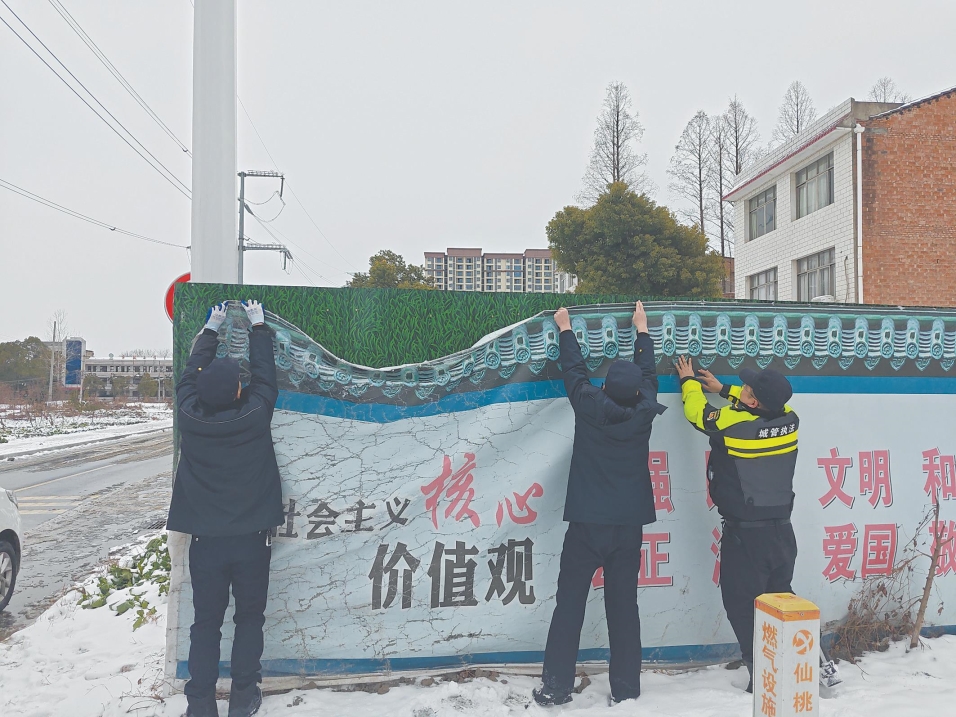执法队员聚焦城区主次干道、商圈周边、居民密集区等重点区域,将户外广告牌、店铺招牌、高空悬挂物、楼宇外立面上的附属设施作为排查核心,针对存在松动、锈蚀等安全隐患的设施,立即联系责任单位加固或拆除。同时,主动清理设施上残留的积雪积冰,耐心告知商户做好日常巡检,切实守牢市民“头顶上的安全”。