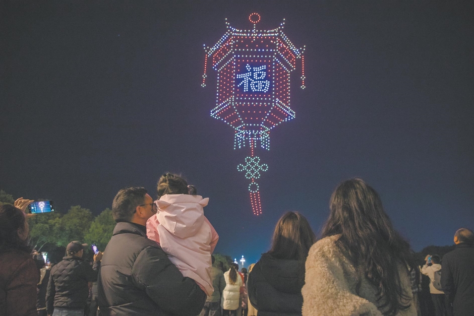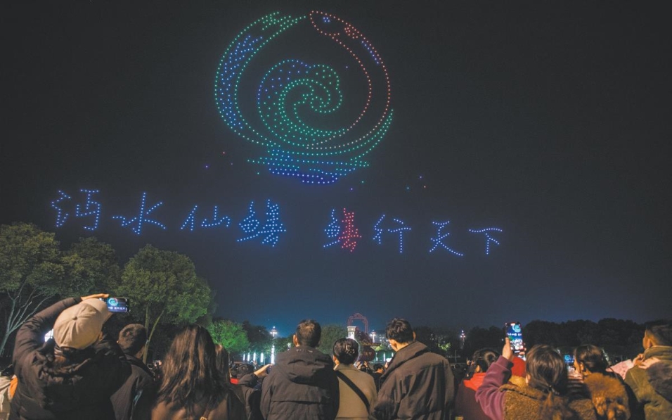 当晚7时06分,随着倒计时结束,2026年仙桃庆元宵焰火晚会在千架无人机表演中启幕。夜空中,“桃花迎春”“上元赏灯”“喜乐元宵”“我爱仙桃”等12幅无人机组成的画面渐次闪亮,斑斓灯色与熠熠星光交织下,现场观众沉浸式感受科技与烟火碰撞的双重浪漫。