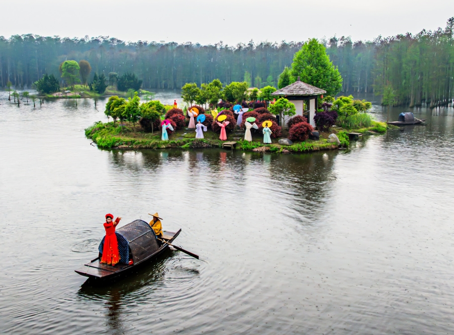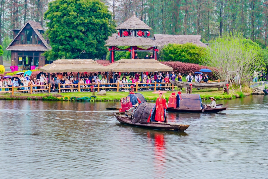 春日梦里水乡,生态人文相映成趣。荷塘村内灰墙黛瓦、小桥流水,古朴村落满溢乡愁韵味;花海间二月兰与油菜花竞相绽放,游客乘舟赏景、驻足留影,沉浸式体验“人在画中游”的诗意美好。图为4月6日,景区上演特色“水上婚礼”,独特民俗风情吸引岸边游客纷纷驻足观赏、拍照打卡。摄影记者郑恒