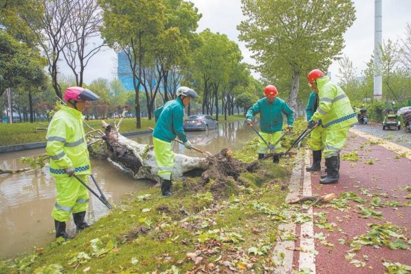 4月9日,受暴雨天气影响,城区部分路段树木出现倒伏、断枝等,市园林部门迅速出动,及时处理倒树断枝,确保市民出行通畅。图为园林工人清理倒伏树木。摄影记者 刘贤双