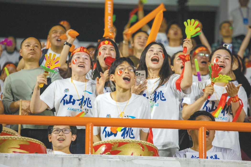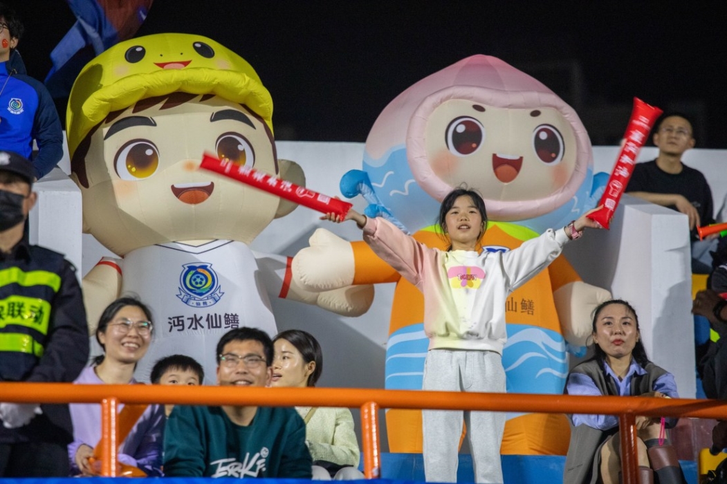 10面宽达两米的蓝色战旗满满仙桃元素,迎风招展。鼓点整齐,高声呐喊,节奏协调。球迷们的呐喊声穿透赛场,瞬间点燃现场氛围,让客场赛场变成“第二主场”。“仙桃鳝宝”“桃花仙子”卡通人偶秒变打卡点,吸引球迷纷纷合影。
