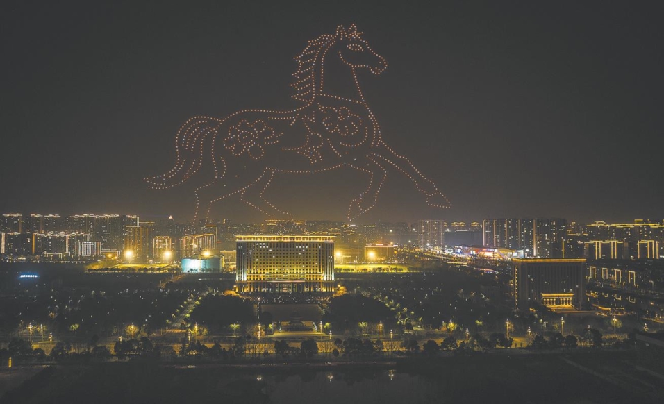 当晚7时06分,随着倒计时结束,2026年仙桃庆元宵焰火晚会在千架无人机表演中启幕。夜空中,“桃花迎春”“上元赏灯”“喜乐元宵”“我爱仙桃”等12幅无人机组成的画面渐次闪亮,斑斓灯色与熠熠星光交织下,现场观众沉浸式感受科技与烟火碰撞的双重浪漫。