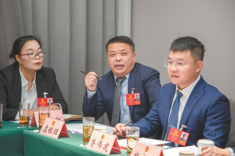 通海口代表团代表踊跃建言。摄影记者邓娟