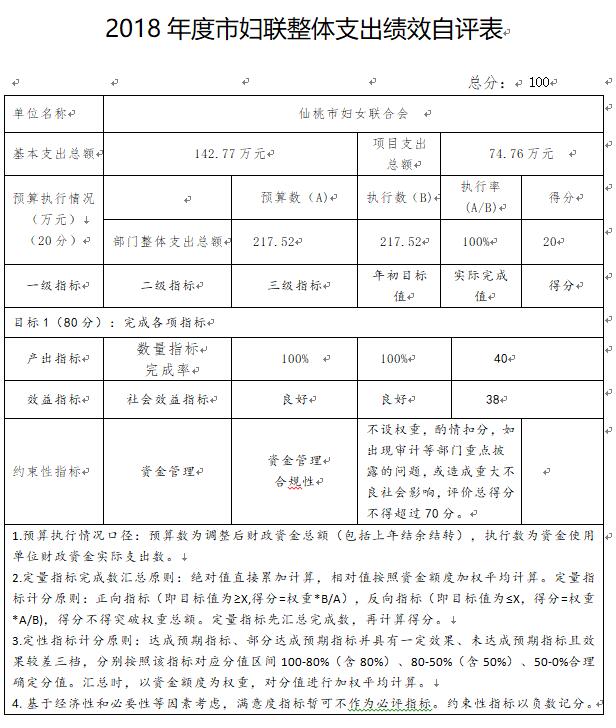 根据预算绩效管理要求,我单位组织对2018年一般公共预算项目支出全面开展绩效自评,共涉及项目2个,资金74.76万元,占一般公共预算项目支出总额的35%,从评价情况来看,我单位各项工作均正常开展,资金使用取得了较好的效益。我单位按照要求组织开展整体支出绩效评价,评价情况来看,2018年市妇联各项工作进展有序、成效明显。
