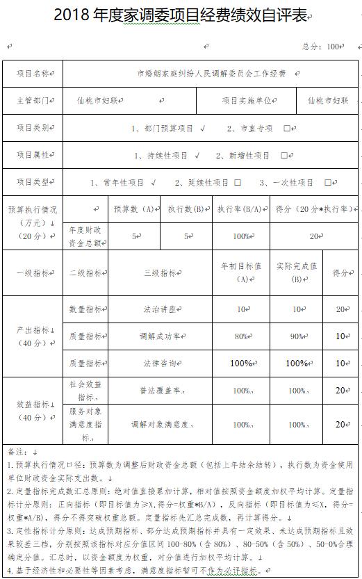 家调委项目经费自评综述:项目全年预算数为5万元,执行数为5万元,执行率为100%。1.产出指标完成情况分析。数量指标,年初目标值10,实际完成值10,完成率100%。质量指标,年初目标调解成功率80%,法律咨询100%,实际调解成功率90%,法律咨询100%,完成率100%。2.效益指标完成情况分析。社会效益指标,社会效益指标,年初目标普法覆盖率100%,服务对象满意度100%,实际普法覆盖率100%,服务对象满意度100%,2018年绩效目标全部完成。
