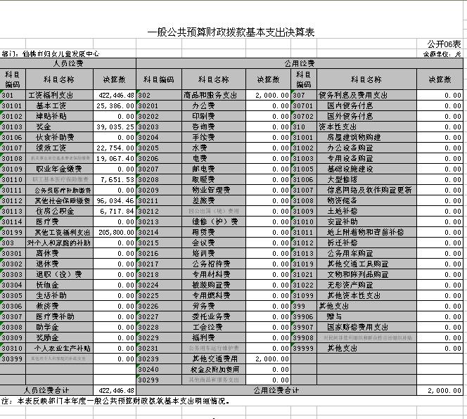 一、2018年度市妇女儿童发展中心工作概况 今年以来,仙桃市妇女儿童发展中心紧紧围绕市委市政府和仙桃市妇女联合会的中心工作,为了妇女儿童的一切,一切为了妇女儿童,全面各项工作,取得了明显成效。 二、收入支出总体情况说明 2018年,市妇女儿童发展中心收入总计424446.48元,其中财政拨款收入424446.48元。2018年支出总计424446.48元,其中基本支出424446.48元(人员支出422446.68元,日常公用支出2000元)。 三、一般公共预算财政拨款支出情况说明 (一)财政拨款支出决算总体情况。 市妇女儿童发展中心2018年收入合计424446.48元,其中:其中,财政拨款42.45万元,上年结转0元,其他收入0元。 (二)财政拨款支出决算结构情况 2018年财政拨款支出424446.48元,主要用于一般公共服务支出422446.48元,占总支出的99.5%。 (三)财政拨款支出决算具体情况 市妇女儿童发展中心2018年财政拨款支出年初预算为424446.48元,支出决算为424446.48元,完成年初预算的100%。其中: 工资福利支出422446.48元,占总支出的99.5%;;商品服务支出2000元,占总支出的0.05%; 四、一般公共预算财政拨款基本支出情况说明 市妇女儿童发展中心2018年财政拨款基本支出424446.48元,其中:人员经费422446.48元,商品服务支出经费2000元。 五、一般公共预算财政拨款“三公“经费支出情况说明 (一)“三公经费”财政拨款支出决算情况说明 市妇女儿童发展中心2018年“三公经费”支出为0元,其中:因公出国(境)费0万元;公务用车购置及运行维护费0元,公务接待费0元。 六、政府性基金收支决算情况说明 市妇女儿童发展中心2018年政府性基金收入0万元,支出0万元。 七、预算绩效情况说明 (一)预算绩效管理工作开展情况 根据预算绩效管理要求,我单位组织对2018年一般公共预算项目支出全面开展绩效自评,因未涉及项目,按照要求组织开展部门支出绩效评价,评价情况来看,2018年市妇女儿童发展中心各项工作进展有序、成效明显。 (二)绩效评价结果应用情况 1、部门绩效评价结果应用情况 按照预算部门合理使用资金,使单位正常工作开展有序进行。 2、绩效自评结果拟应用情况 一是细化绩效目标,提高指标相关性与可量化性;二是科学制定预算申报,优化项目资金支出结构;三是完善绩效信息采集,增加第三方数据比例。 八、其他重要事项的情况说明 固定资产出租出借情况 市妇女儿童发展中心2018年共有四处房产出租出借,四处房产全部严格按照固定资产管理流程进行出租出借,所有房租全部上缴财政国库。 第四部分 名词解释 (一)财政拨款(补助)收入:指省级财政预算安排且当年拨付的资金。 (二)一般公共服务支出(201类):反映政府提供一般公共服务的支出。 (三)政府办公厅(室)及相关机构事务(20103款):反映各级政府办公厅(室)及相关机构的支出。 (四)行政运行(2010301项):反映行政单位(包括实行公务员管理的事业单位)的基本支出。 (五)专项业务活动(2010305项):反映各级政府举行各类重大活动、召开重要会议(如国务院一类会议、国庆招待会、全国劳模大会)的支出,政府机关房地产管理、公务用车管理等方面的支出。 (六)社会保障和就业支出(208类):反映政府在社会保障与就业方面的支出。 (七)行政事业单位离退休(20805款):反映用于行政事业单位离退休方面的支出。 (八)归口管理的行政单位离退休(2080501项):反映实行归口管理的行政单位(包括实行公务员管理的事业单位)开支的离退休经费。 (九)医疗卫生与计划生育支出(210类):反映政府医疗卫生与计划生育管理方面的支出。 (十)医疗保障(21005款):反映用于医疗保障方面的支出。 (十一)行政单位医疗(2100501项):反映财政部门集中安排的行政单位基本医疗保险缴费经费,未参加医疗保险的行政单位的公费医疗经费,按国家规定享受离休人员、红军老战士待遇人员的医疗经费。 (十二)基本支出:指为保障机构正常运转、完成日常工作任务而发生的人员支出和公用支出。 (十三)项目支出:指在基本支出之外为完成特定行政任务和事业发展目标所发生的支出。 (十四)“三公”经费:按照有关规定,“三公”经费包括因公出国(境)费、公务接待费、公务用车购置及运行费。 (十五)公务用车:指单位用于履行公务的车辆,包括领导干部专车、一般公务用车和执法执勤用车。 (十六)其他行业名词解释。