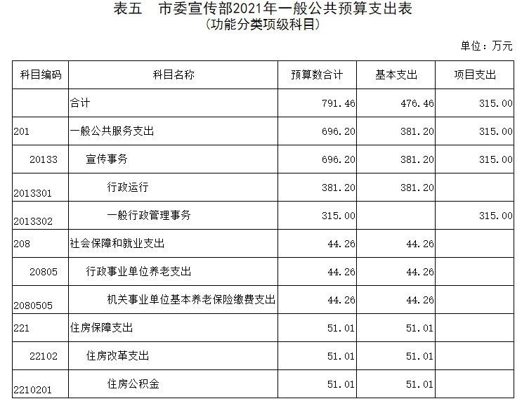 市委宣传部2021年一般公共预算支出预算数791.46万元,其中基本支出476.46万元。具体安排情况如下:
