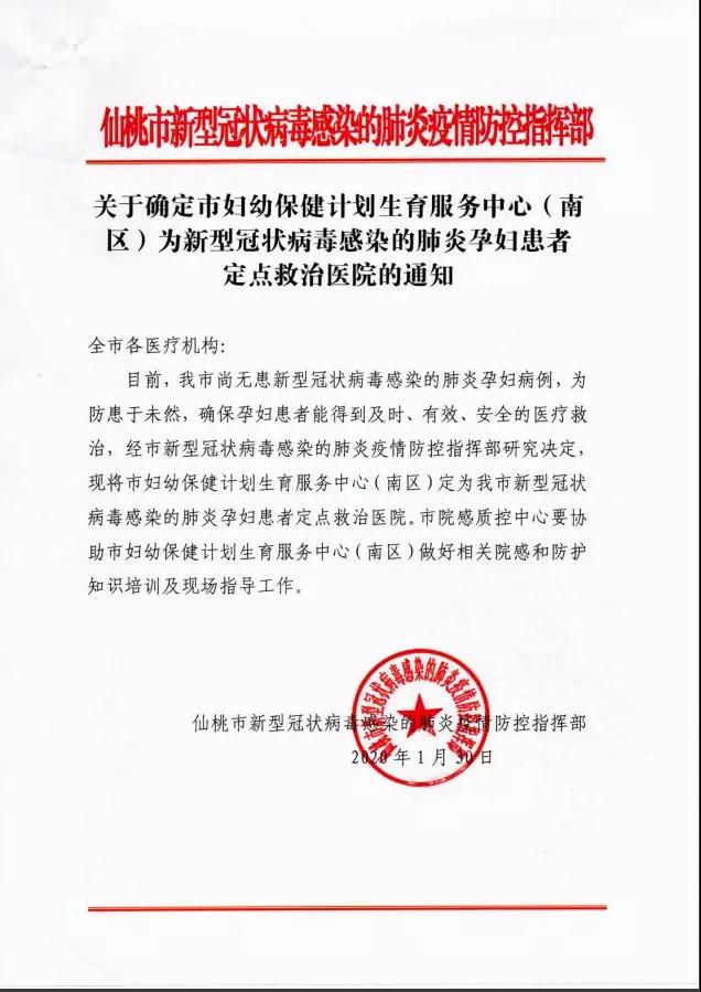 关于确定市妇幼保健计划生育服务中心(南区)为新型冠状病毒感染的肺炎孕妇患者定点救治医院的通知