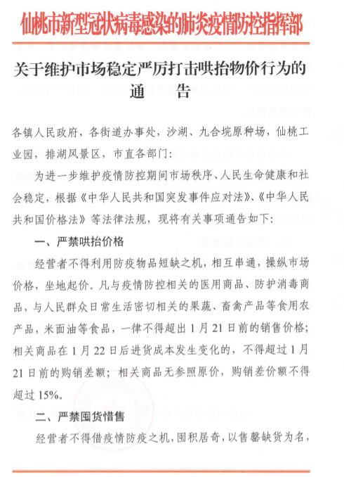 为进一步维护疫情防控期间市场秩序、人民生命健康和社会稳定,根据《中华人民共和国突发事件应对法》、《中华人民共和国价格法》等法律法规,现将有关事项通告如下: