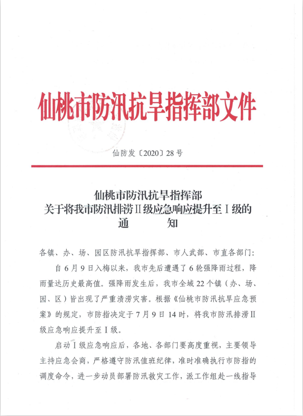 自6月9日入梅以来,我市先后遭遇了6轮强降雨过程,降雨量达历史最高值。强降雨发生后,我市全域22个镇(办、场、园、区)皆出现了严重渍涝灾害。根据《仙桃市防汛抗旱应急预案》的规定,市防指决定于7月9日14时,将我市防汛排涝Ⅱ级应急响应提升至Ⅰ级。