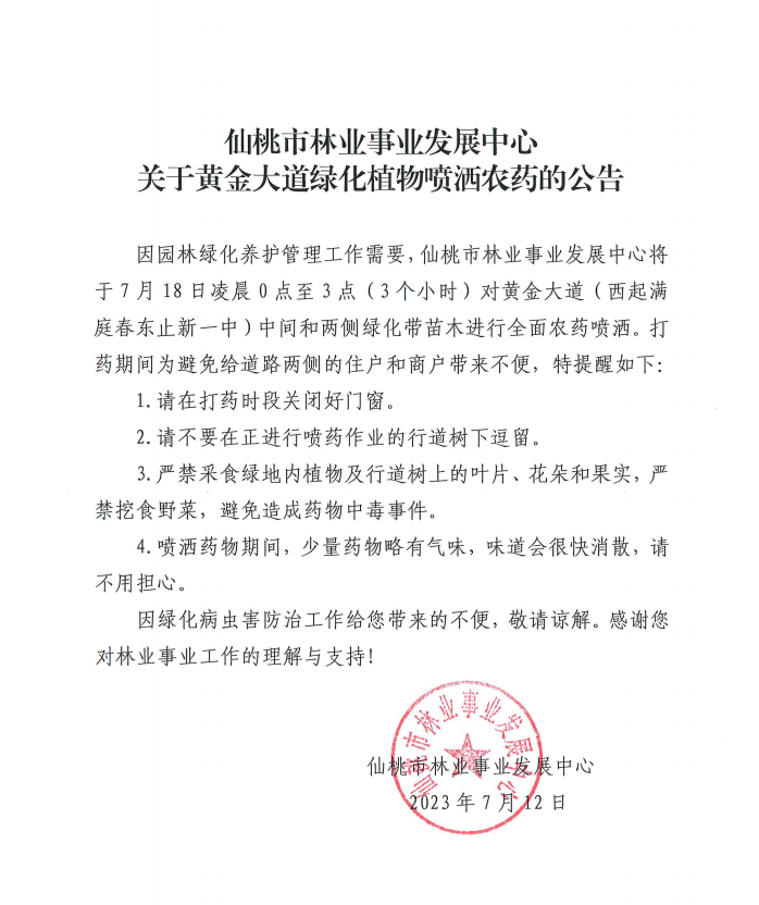仙桃市林业事业发展中心关于黄金大道绿化植物喷洒农药的公告