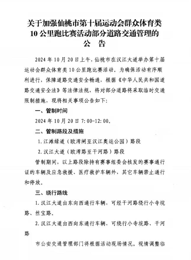 2024年10月20日上午,仙桃市在汉江大道举办第十届运动会群众体育类10公里跑比赛活动。为确保活动有序顺利进行,保障道路交通安全畅通,根据《中华人民共和国道路交通安全法》等法律法规,将对部分道路将采取临时交通限制措施,现将相关事项公告如下: