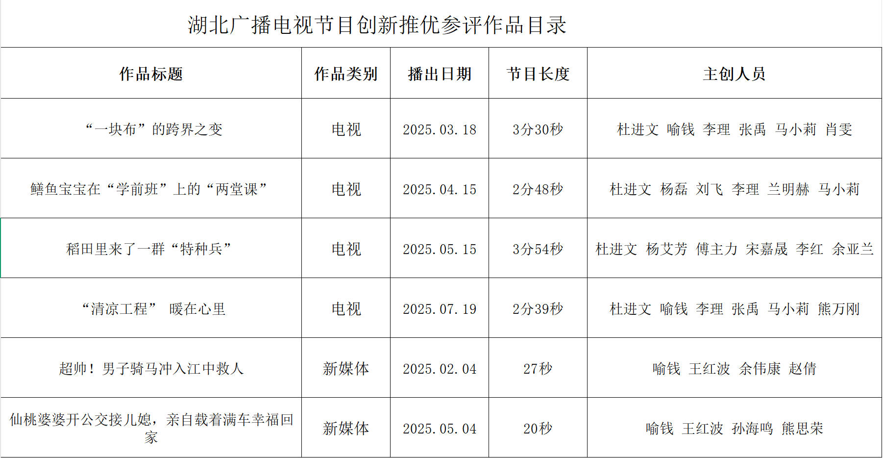 根据湖北省广播电视学会《关于开展2025年度湖北广播电视节目创新推优评选工作的通知》要求,经媒体自荐、主管部门组织初选,拟推荐参评作品如下: