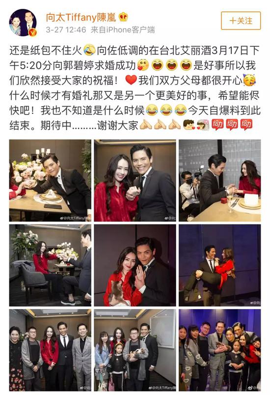 可你们发现了吗?订婚消息是向太——也就是郭碧婷的未来婆婆,亲自发微博证实,还特意强调,“我们双方父母都很开心”、“超期待婚礼能尽快”。