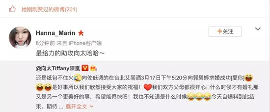 作为儿子儿媳cp最大的“粉头”,发完微博后10分钟,她点赞了150条祝福微博。