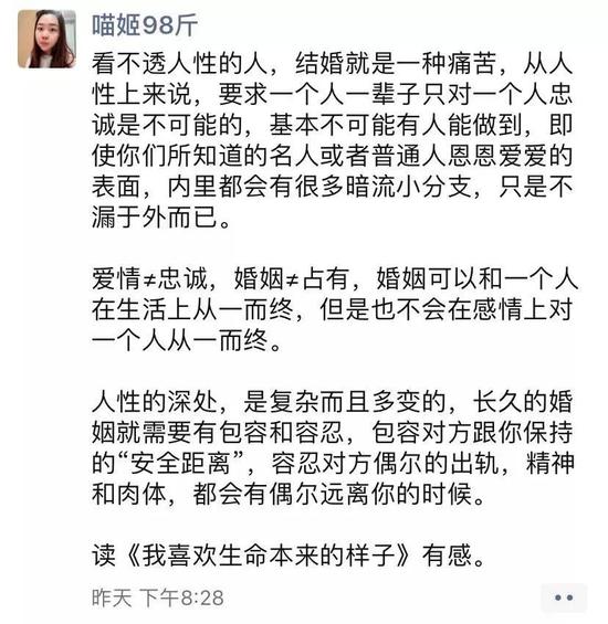 《我喜欢生命本来的样子》在“宽松的婚姻”这一篇里,有一段话是这样的: