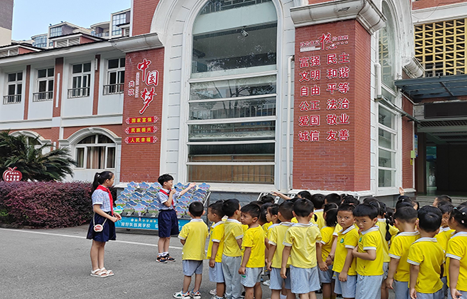 在朝阳的照耀下,孩子们排着整齐的队伍,走进了小学的校园。高大的教学楼、宽阔的操场和整洁的走廊立刻吸引了他们的目光,与幼儿园的环境截然不同,小学的一切都让孩子们感到新奇和兴奋。在讲解员哥哥姐姐的带领下,孩子们参观了小学的校园文化环境,亲身体验了小学生活的氛围。当孩子们亲眼看到一年级的同学们参加少先队入队仪式,佩戴上鲜艳的红领巾时,他们眼中闪烁着向往的光芒。