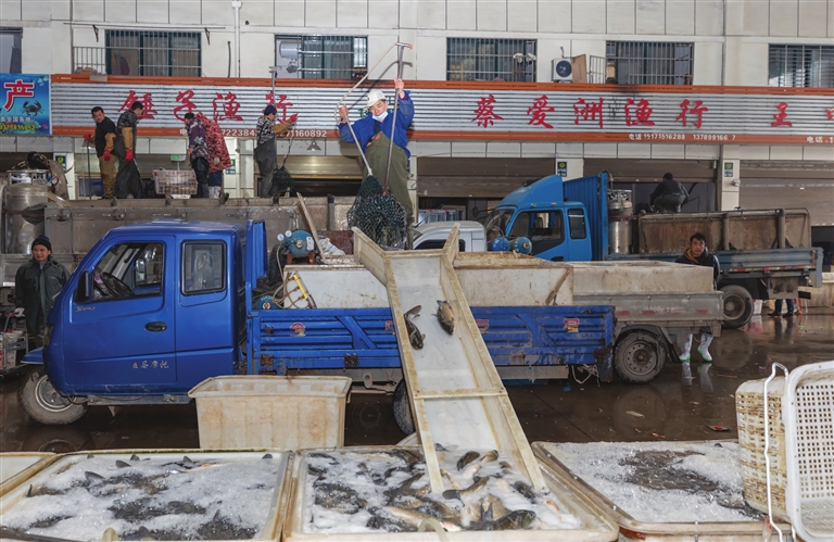 1月5日,一车车鲜鱼运往江汉农产品大市场。摄影 记者 晴霄