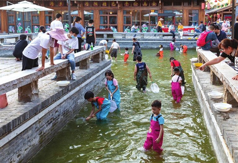 “做旅游就是做文化。”国庆节期间,沔阳小镇充分挖掘老沔阳文化底蕴,将旅游产品与传统民俗文化融合,推出划龙舟体验、水上飞人、清水摸鱼、桨板COS等极具江汉平原水乡特色的互动游戏,编排《千里送鹅毛》情景舞台剧、水上剧、皮影戏等众多文娱节目,精心组织沔阳花鼓戏、渔鼓、仙桃民歌等本土戏曲演艺,策划大型户外实景红色主题剧本杀《沔阳风云》,受到游客们欢迎。