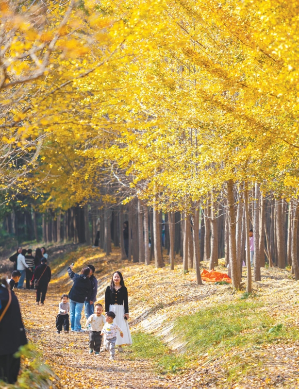 层林尽染,满目流金,城东桃花岭大道银杏林成为市民郊游的好去处。图为11月15日,市民在银杏林里拍照定格秋日美景,孩童在落叶上欢快奔跑,欢声笑语与秋意交织,绘就一幅人与自然相融的生动画卷。摄影记者郑恒