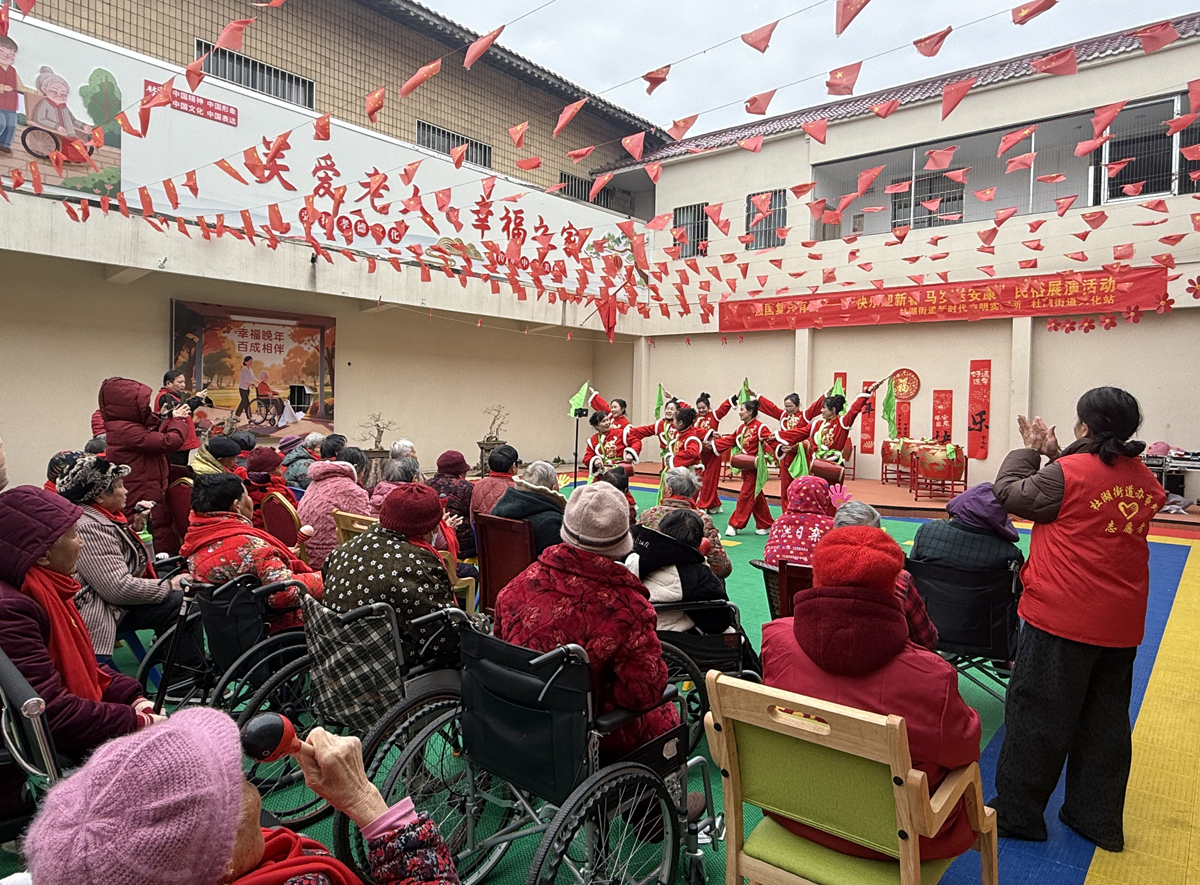 新春将至,近日,杜湖街道新时代文明实践所、杜湖街道文化站联合走进杜湖百成养老院,开展“快乐迎新春 马岁送安康”民俗展演活动,以接地气的民俗盛宴、暖人心的贴心服务,让院内老人们在欢声笑语中感受传统年味与社会温情,践行“强国复兴有我”的民生担当。(仙桃网记者 盛慧慧 通讯员 李娟)