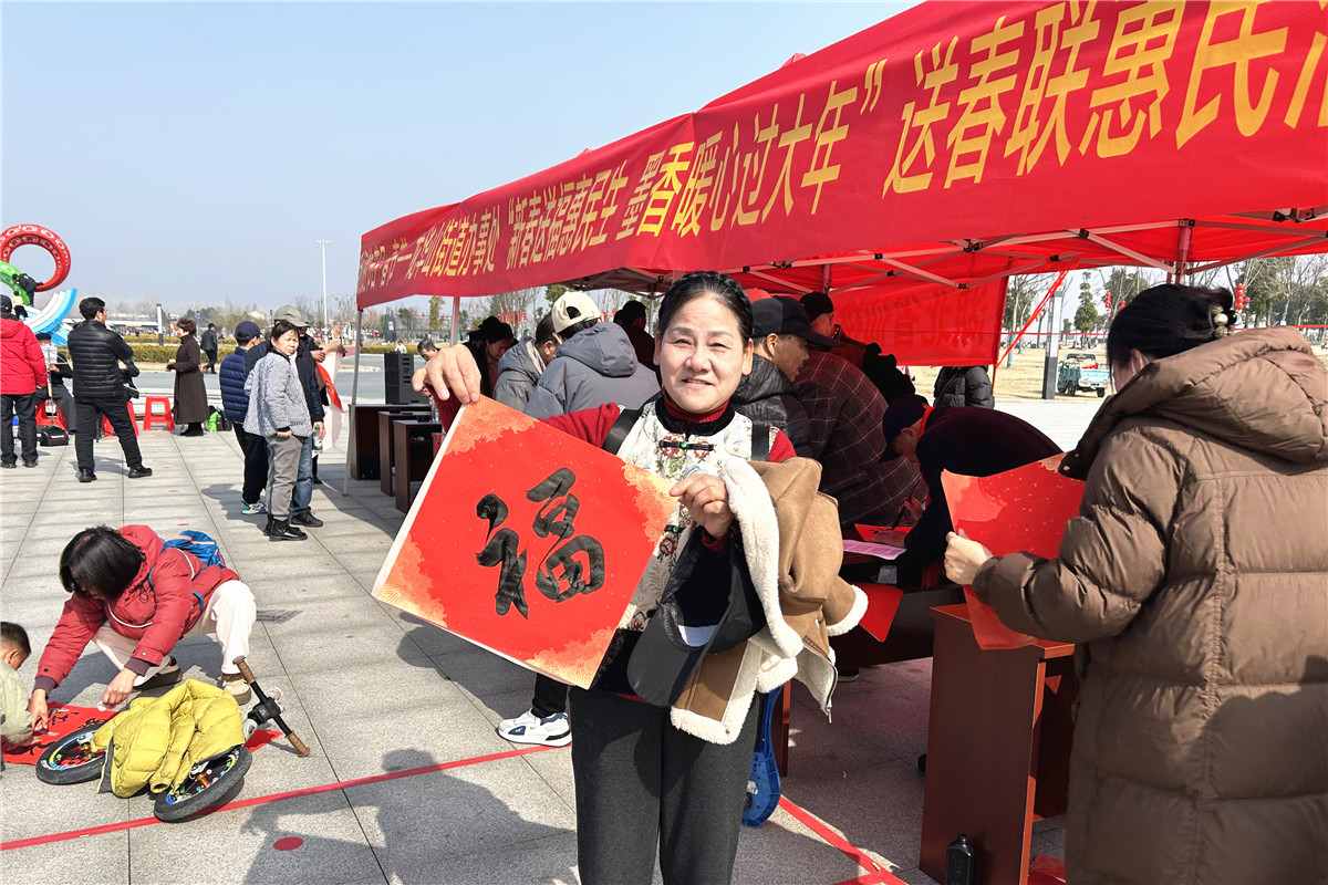 活动现场墨香四溢,数张书案前围满了前来领取春联的居民。市老年书画家协会的老师们铺纸研墨,挥毫书写,将美好的祝愿凝于笔端。一副副寓意吉祥的春联、一个个饱满浑厚的“福”字在红纸上跃然而出,承载着传统年俗的韵味与温度,受到了居民的热烈欢迎。