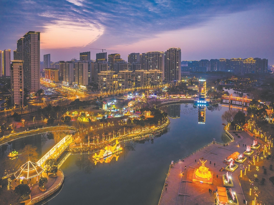 在沔阳公园,我市按照“一带四区、一河三桥”的布局思路,一线串珠连接市民广场、非遗广场、健身广场段,总占地面积约12万平方米,游览路线全长超1.8千米,共计设置24组花灯。在前通河水域(新城大道至朝阳大道段),3个大型水面灯组静卧于水面,虚实相映、如梦如幻,成为灯会中极具观赏性的亮点景观。
