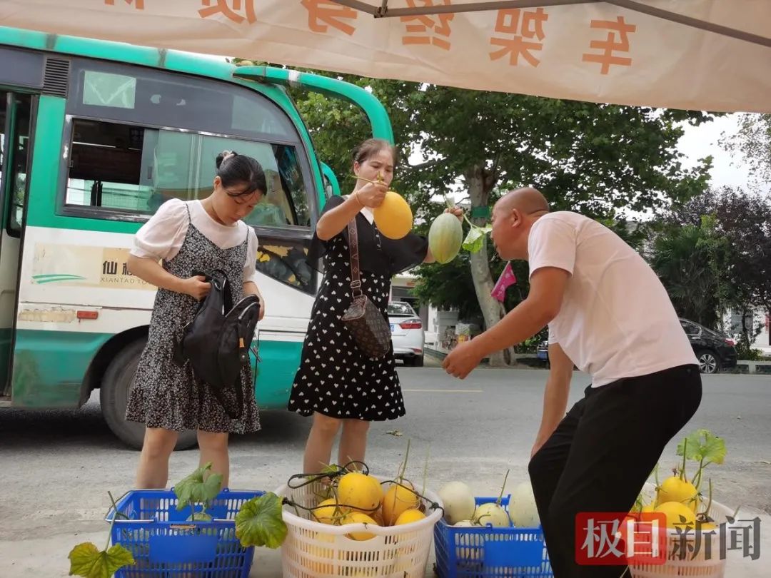 7月中旬的仙桃市三伏潭镇夏市村,骄阳似火。父子俩用不同的方式卖力推销,汗水湿透了背心。318国道旁的瓜棚里,地上摊着白的绿的黄的瓜果,桌上摆着现切的瓜肉,气味芳香怡人。